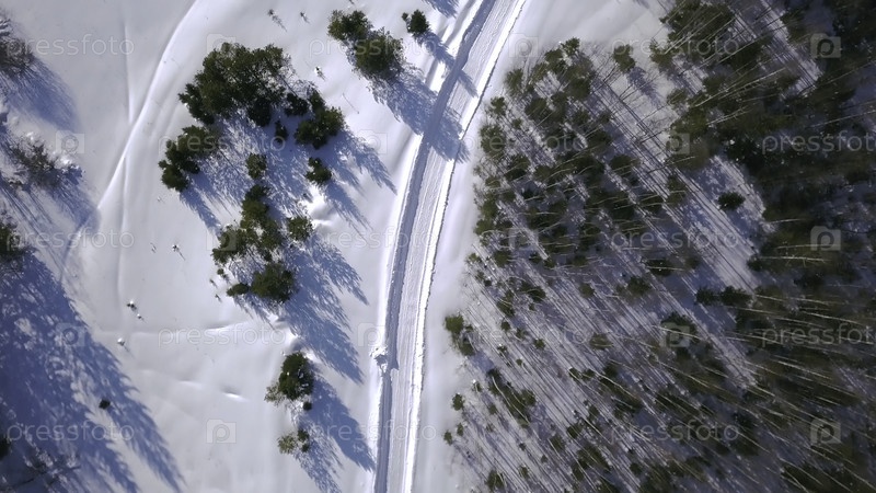 Зимние лесные пространства. Вид с высоты птичьего полета. Огромный снежно-белый лес с большими заснеженными рождественскими деревьями на фоне голубого неба