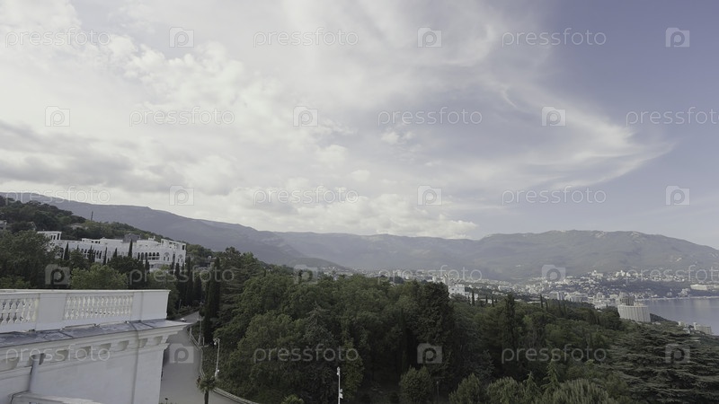Огромные длинные горы и море, а над ними можно увидеть летний лес, облачное небо