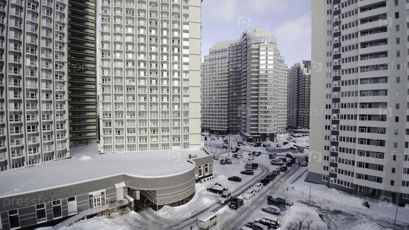 Панорама современного жилого комплекса.Высокие здания на закате солнца.Корпоративное здание в городе