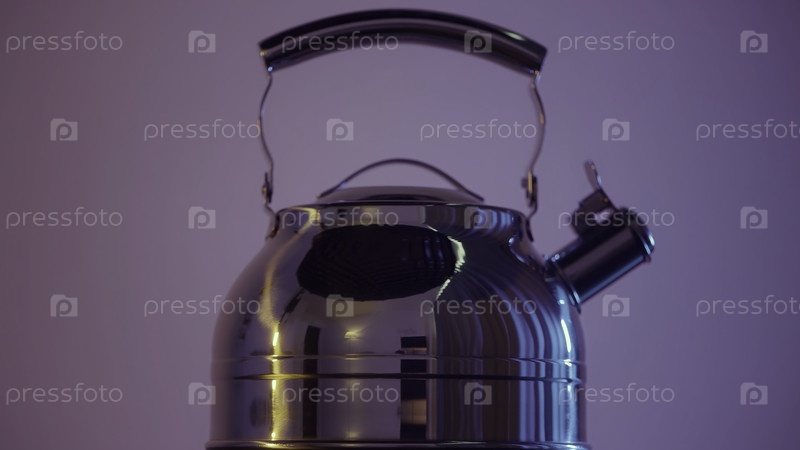 Серебряный чайник из нержавеющей стали на розовом фоне стены. продолжайте. закрытие нового электрического чайника медленно вращается, концепция бытовой техники