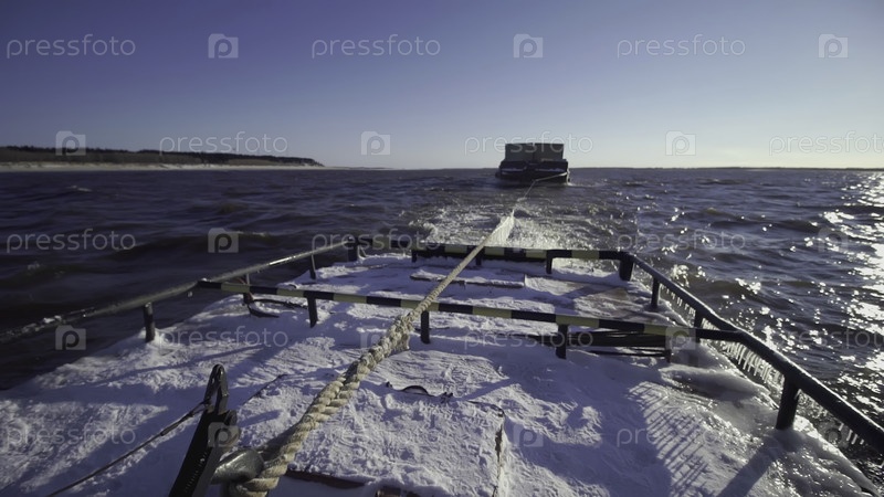Рыбацкая лодка плавает в море на закате. Клип. Вид с баржи на морской горизонт. Романтическое купание на рассвете в море