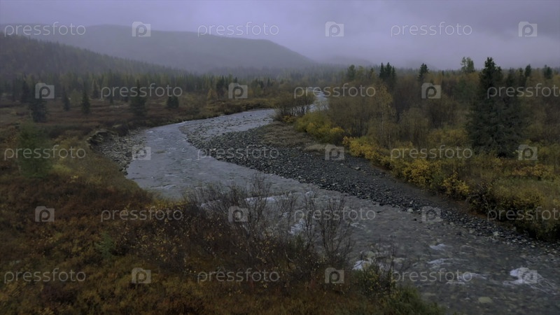 Красивая природа с беспилотника. Клип. Чистая река рядом с лесом с высокими ёлками и камнями течет в этом направлении