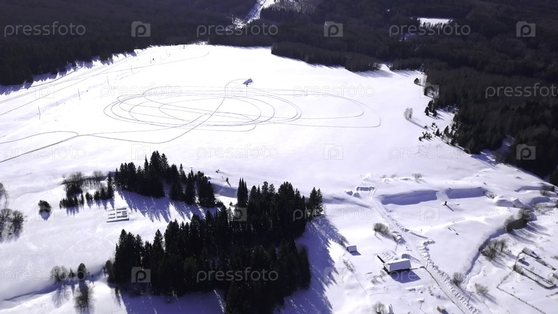 Снежная зима солнечный лес рядом с жилыми маленькими домами и большими снежными дырками