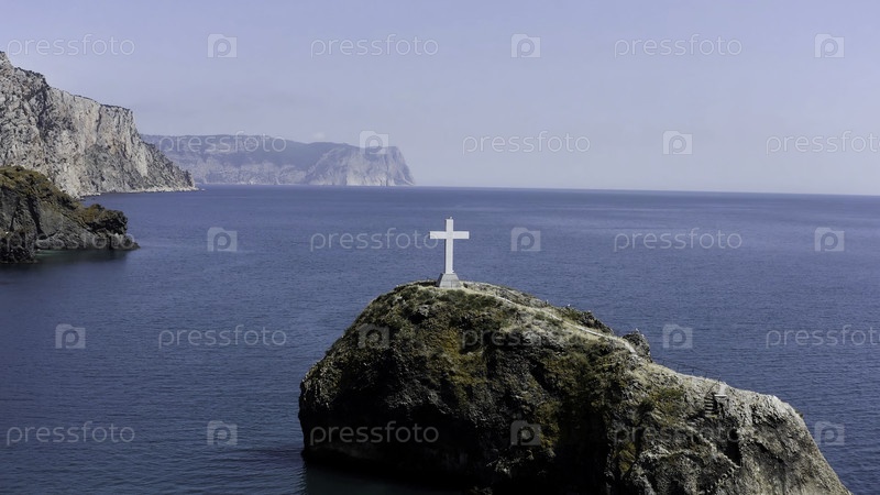 Вид с воздуха на красивый мыс Фиолент и скалу Святого Георгия с белым крестом. продолжайте. морской пейзаж с горным хребтом у моря и знаменитым туристическим направлением