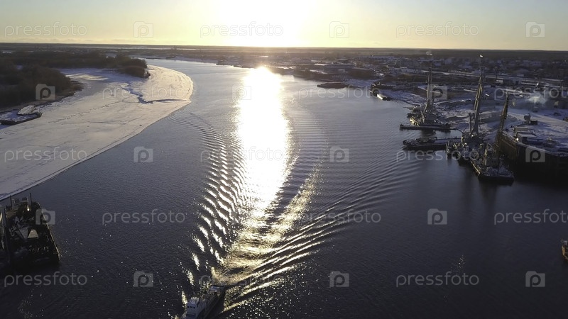 Весенний пейзаж, где большие суда экспортируют грузы вдоль реки рядом с голыми слегка заснеженными лесами