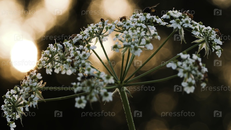 Блоки и муравьи в цветке.Креативно.Маленькие насекомые ползут на маленьком белом цветочке, а за вами видно, что солнце тихо садится