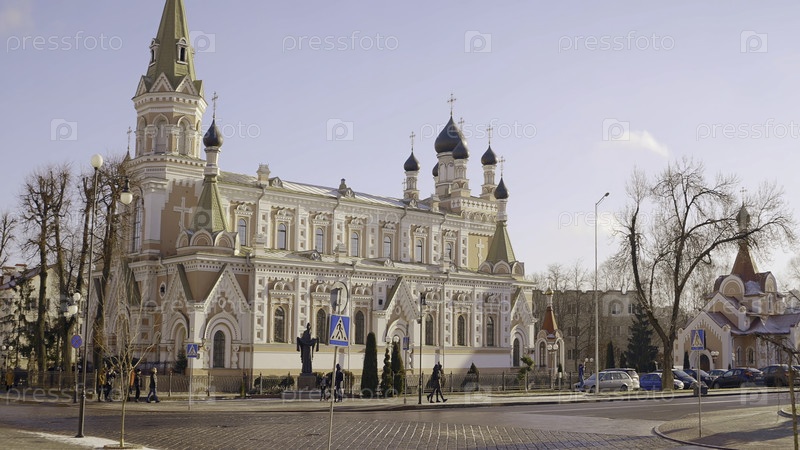 Покровский собор. вперед. огромная церковь из красного камня с длинными золотыми куполами стоит на перекрестке, где многие люди ходят по своим делам. высококачественный 4k кадры