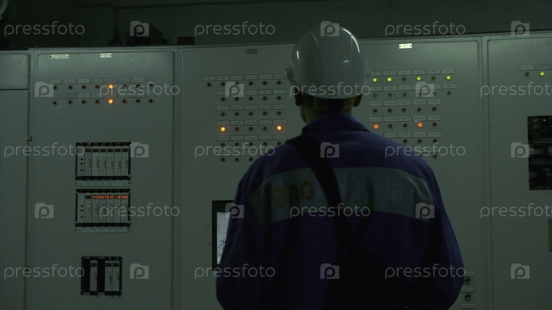 Рабочий в униформе и шлеме на промышленном заводе.Клип.Мужчина в форме работает на фабрике.Профессиональный работник на промышленной или электростанции