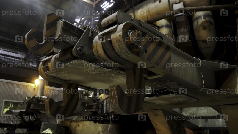 Закрыть металлургический корзину на сталелитейном заводе, концепция тяжелой промышленности.Гигантские крюки для подвешивания специальных контейнеров