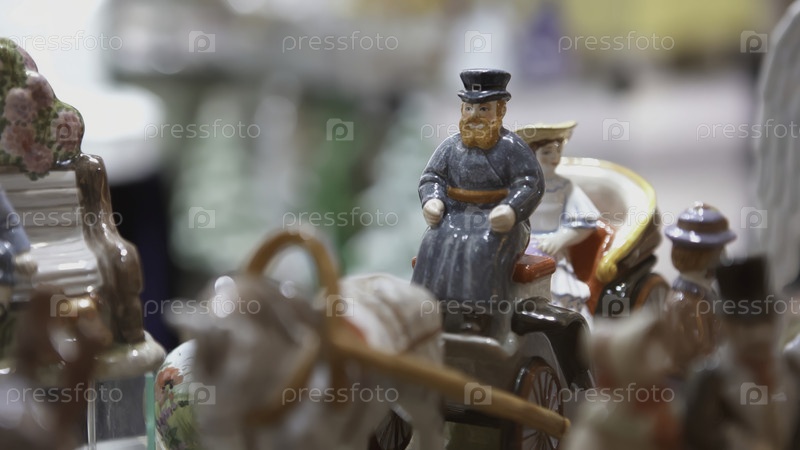 Екатеринбург, Россия - 25 февраля 2022: керамические статуэтки с изображением крестьян и горожан. Искусство. Фигуры землевладельца с лошадью и женщиной в платье. Фамгурки фаяны и глины, покрытые глазурью, изображающие леди, джентльменов и лошадей