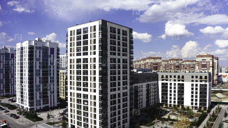 Вид на красивый жилой район с современными домами. Резервные кадры. Жилой район с современными зданиями и планировкой. Жилой комплекс в солнечный летний день с облаками