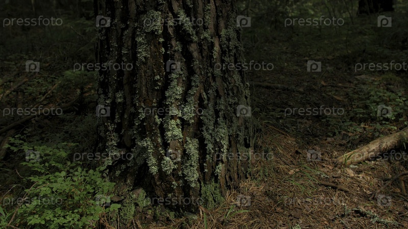 Летнее дерево, заросшее травой в лесу рядом со всеми видами ветвей и травы, которая растет
