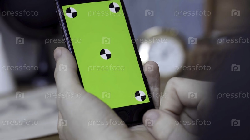 Мужчина использует мобильный смартфон дома. резервные записи. Закрыть телефон с зеленым экраном в руках мужчины