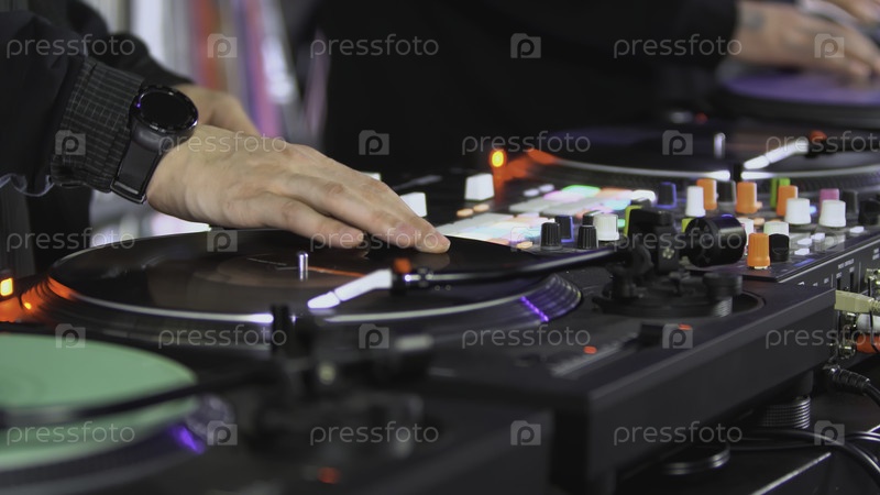 Диджеи играют в дискотеке. Искусство. Покрытие руки диджея на миксере. Яркая музыкальная панель на вечеринке. Работа музыкантов в ночном клубе