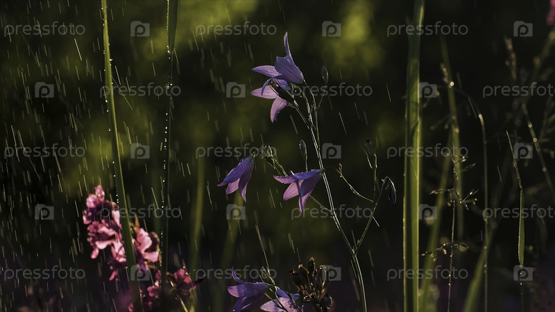 Полив голубых колоколов. Творчество. Вода опрыскивает красивые цветы синего колокола. Полив садовых цветков в солнечный летний день