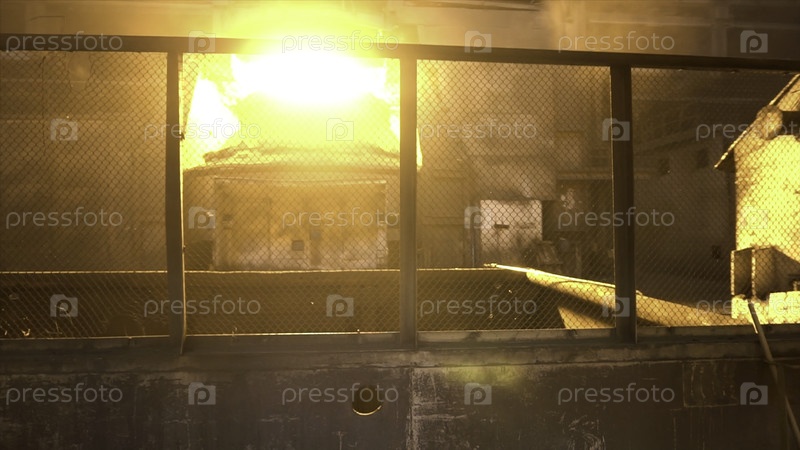 Металлический сталелитейник в специальной форме проходит через металлургические мастерские с говядиной металлической печи. резервные кадры. работает на металлургическом заводе