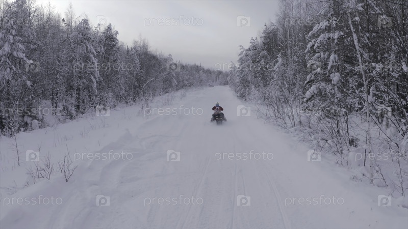 Снегоход на автомагистрали зимнего леса. Красивая зимняя дорога для экстремального вождения снегоходом. Экстремальные виды спорта зимой