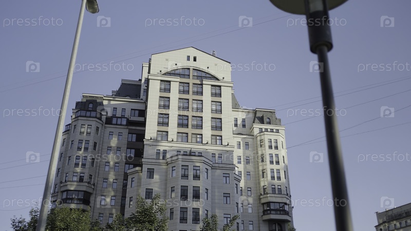 Московский жилой комплекс. Идите вперед. Многоэтажное здание рядом с деревьями на фоне голубого неба. Высококачественные кадры 4k