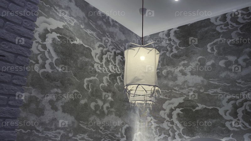 Закройте декоративную лампу холодным светом, украшение комнаты. HDR. Лампа, висящая на потолке квартиры с серой стеной.e-лампа с теплым освещением, геометрический дизайн. HDR. Вертикальные огни вешаются на стену торгового центра