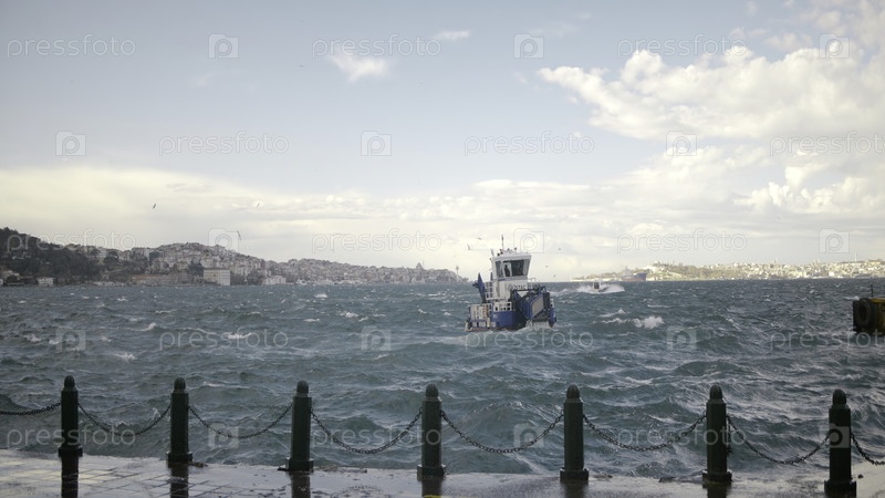 Вы можете увидеть голубое волновое море, на котором плывет белый корабль, и город с маленькими домами на берегу