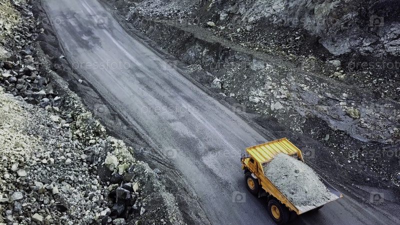 Сверху видно вождение оранжевого грузовика с обломками на открытой дорожной яме Тяжёлый транспорт в горнодобывающей промышленности