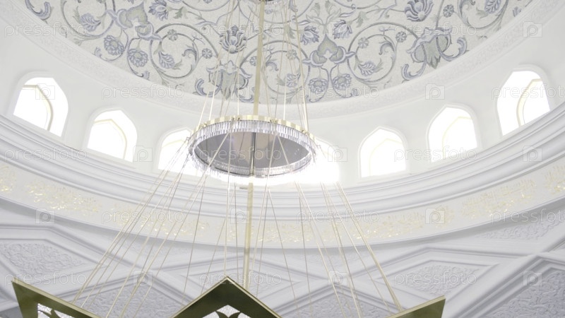 Огромная стеклянная люстра.Сцена.Белое здание с окрашенным потолком, на котором висит огромная модная люстра из маленького аккуратного стекла