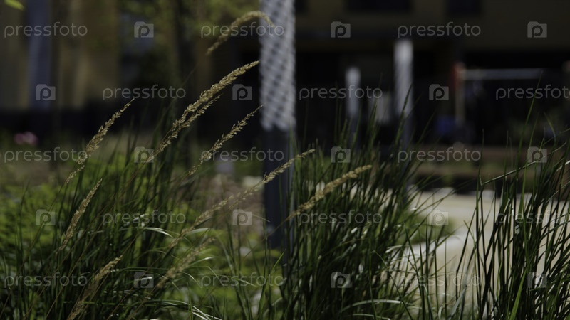 Зеленая уличная отделка с кустами и травой возле многоквартирного дома. резервные кадры. летний пейзаж и двор