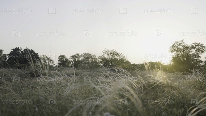 Прекрасный закат солнца над летним лугом с золотыми ушами
