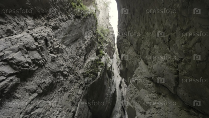 Геологическое образование с очень узким проходом. идите вперед. нижний вид каменного ущелья со зелени