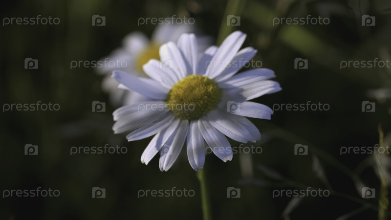 Красивая ромашка растет на поле. Творческая. Цветок с белыми лепестками и желтым центром. Ветер дует цветом, растущим в поляне