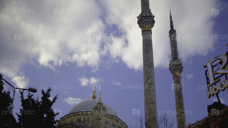 Стамбул, Турция 1 октября 2021: Вид на минареты мечети в Стамбуле. Идите дальше. Красивые минареты возвышаются в древней мечети. Мечеть Ортака на Босфоре в пасмурный день