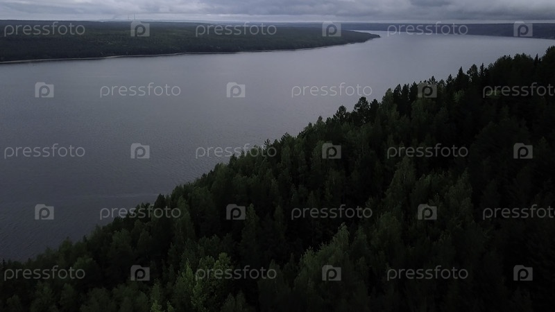Серый пейзаж с лесом и туманом. Клип. Тёмный вид на реку в лесу со зелёными высокими деревьями с серым небом над головой. Высококачественная запись 4k