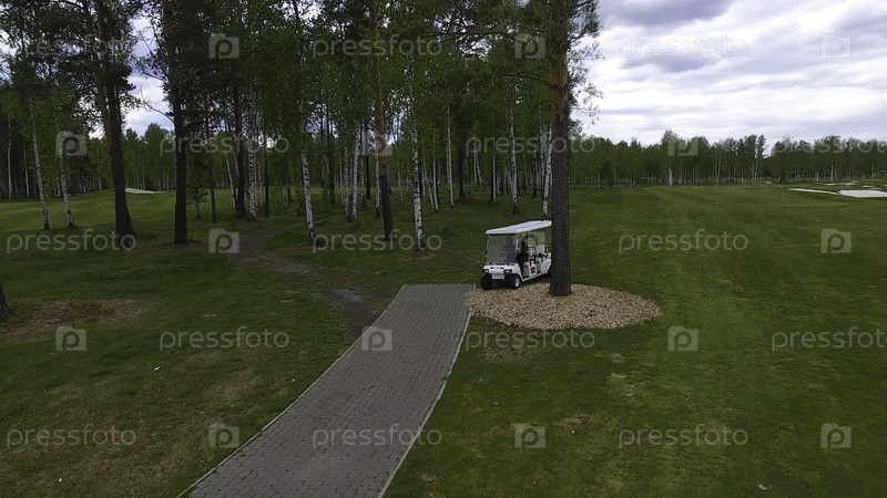 Вид на гольф-коляску на поле для гольфа днем с копировальным помещением