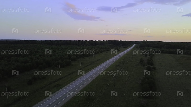 Летающий над сельской дорогой и зелеными полями, воздушный вид. Бесконечная ровная местность, покрытая летними кустарниками и травой среди раннего заката солнца