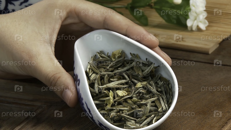 Стеклянный чайник с цветущим чаецветком внутри на деревянном фоне, китайский зеленый чай листья близко в традиционной чайной церемонии