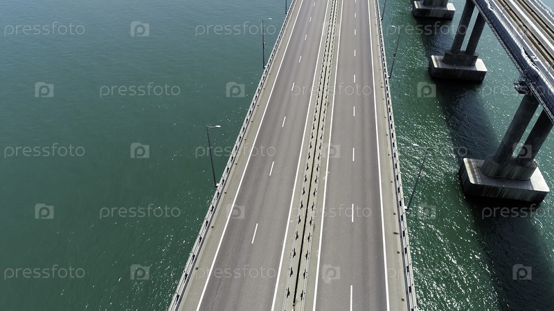 Летите над новым белым мостом с движущимися транспортными средствами. идите вперед. зрелищный морской пейзаж с длинным мостом через голубую спокойную воду