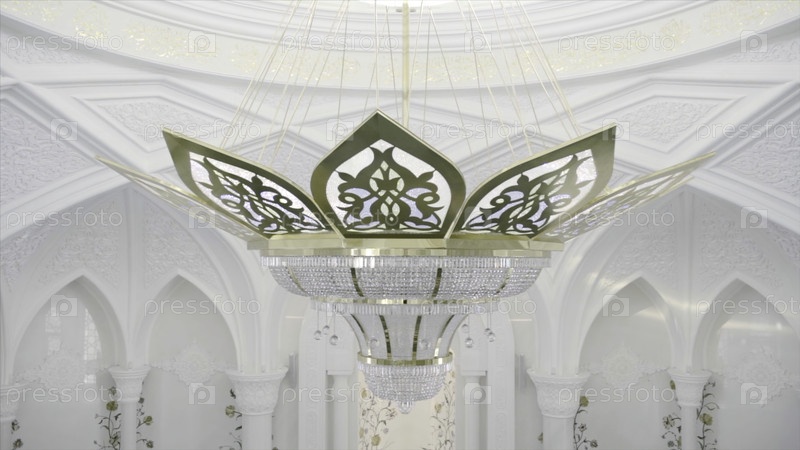 Интерьер мечети с декоративным потолком. Сцена. Белая красивая мечеть со золотыми резными перилами и куполом