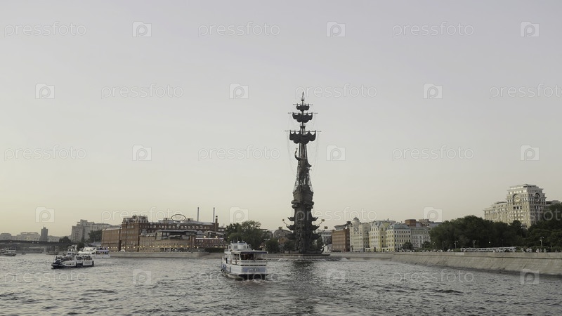 Московская набережная реки с видом на памятник Петру I на фоне заходящего неба. Продолжайте. Судно, плавающее вдоль набережной города Москвы