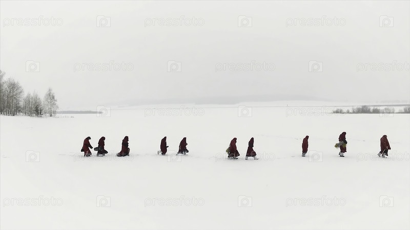Группа людей, путешествующих по тайге или заснеженному лесу следуют друг за другом. Кадр. Группа людей на зимних походах в горах, туристы, гуляющие в снежном лесу