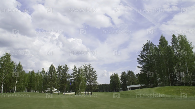 Карта солнечного гольфа с облаками в синем небе и лесным озером