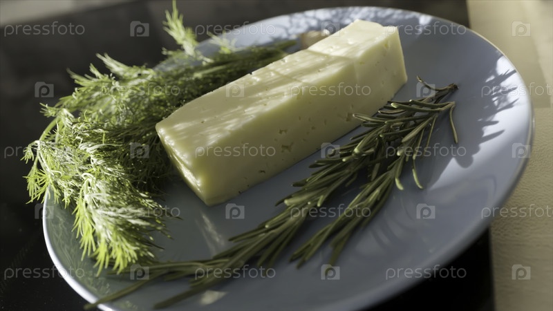 Закройте сыр и зелень на стеклянной тарелке. резервные кадры. вкусный сыр со свежим зелёным уксусом и розмарином, еда и французская циузинная концепция