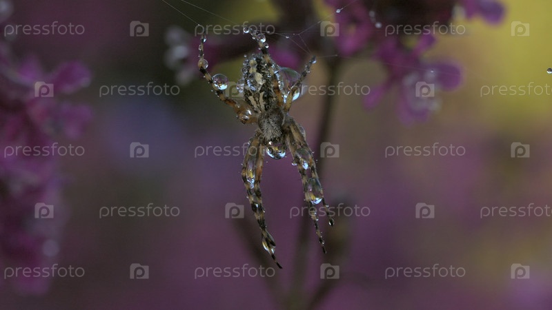 паук в сети с росой на летнем лугу. творческий. дикий паук в сети после дождя на летном луге. солнечный день в макромире луга