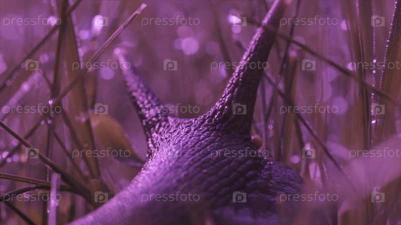 Закрытие улитки в траве. Творчество. Медленно движущаяся виноградная улитка на траве. Макрокосм летнего луга. Розовый фильтр