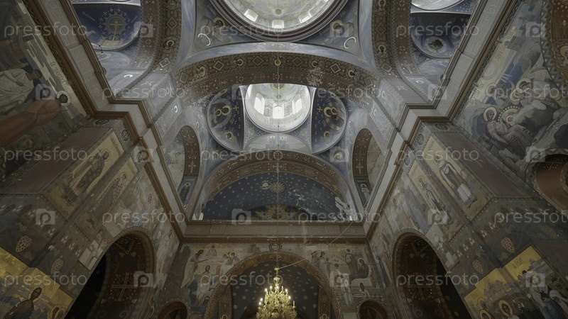 Нарисованная церковь. Клип. Большой храм с огромным потолком, на котором изображены иконы в круге и небольшие окна в самом верхнем углу. Высококачественные кадры 4k