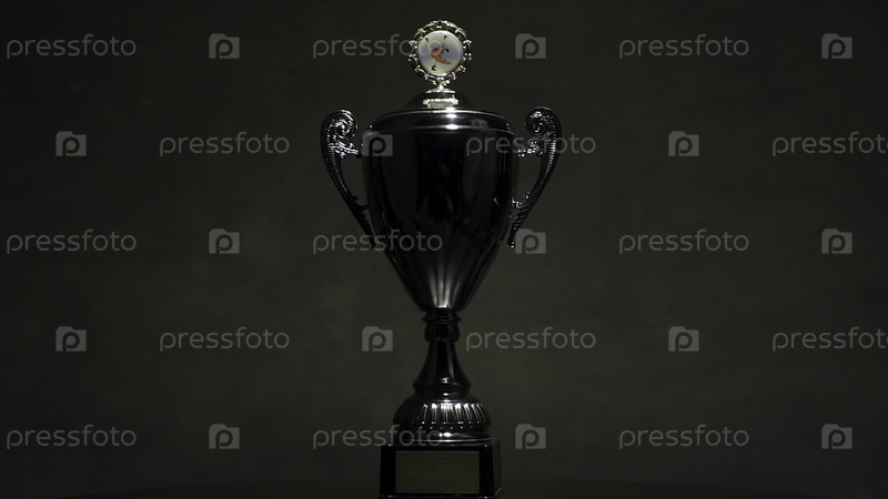 Золотой трофей чемпиона, расположенный на деревянном столе с темным фоном копирования пространства, готов выиграть дизайн. натюрмортный трофей, снятый в студии. золотой трофей чемпиона на деревянном столе