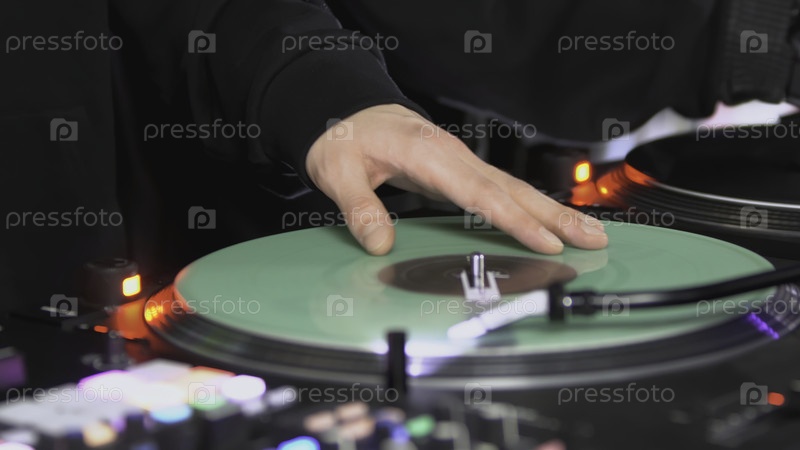 Диджеи играют в дискотеке. Искусство. Покрытие руки диджея на миксере. Яркая музыкальная панель на вечеринке. Работа музыкантов в ночном клубе