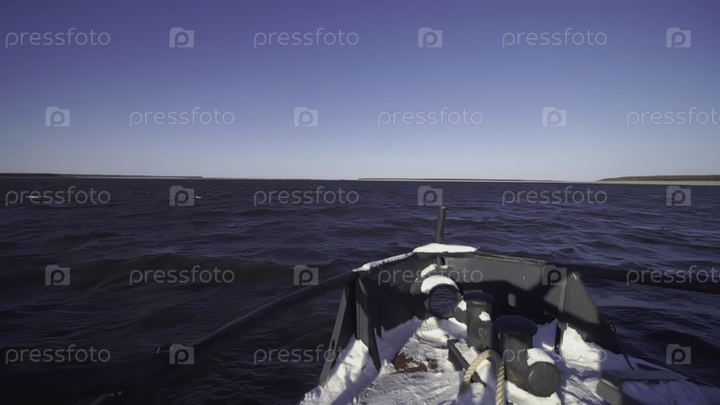 Рыбацкая лодка плавает в море на закате. Клип. Вид с баржи на морской горизонт. Романтическое купание на рассвете в море