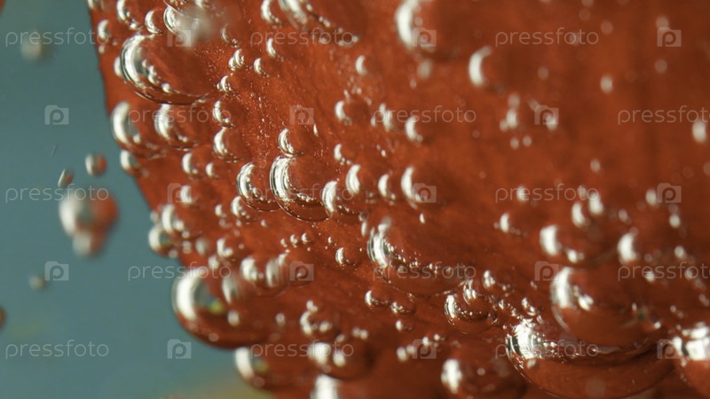 Красный лепесток с маленькими пузырями на нем. резервные кадры. Прозрачная вода, внутри которой пузыри обворачивают огромный лепесток и зависают от него. Высококачественный персонал FullHD
