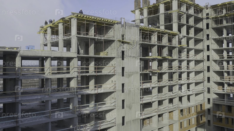 Строительная площадка работает против голубого неба.Рабочие на строительной площадке многоквартирного дома