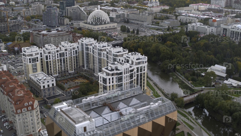 Прекрасные пейзажи с беспилотного летательного аппарата. Стоковые кадры. Яркий вид на офисные здания, расположенные в центре города и красивый парк с рекой, по которой гуляют туристы. Высокое качество 4k видеосъемки